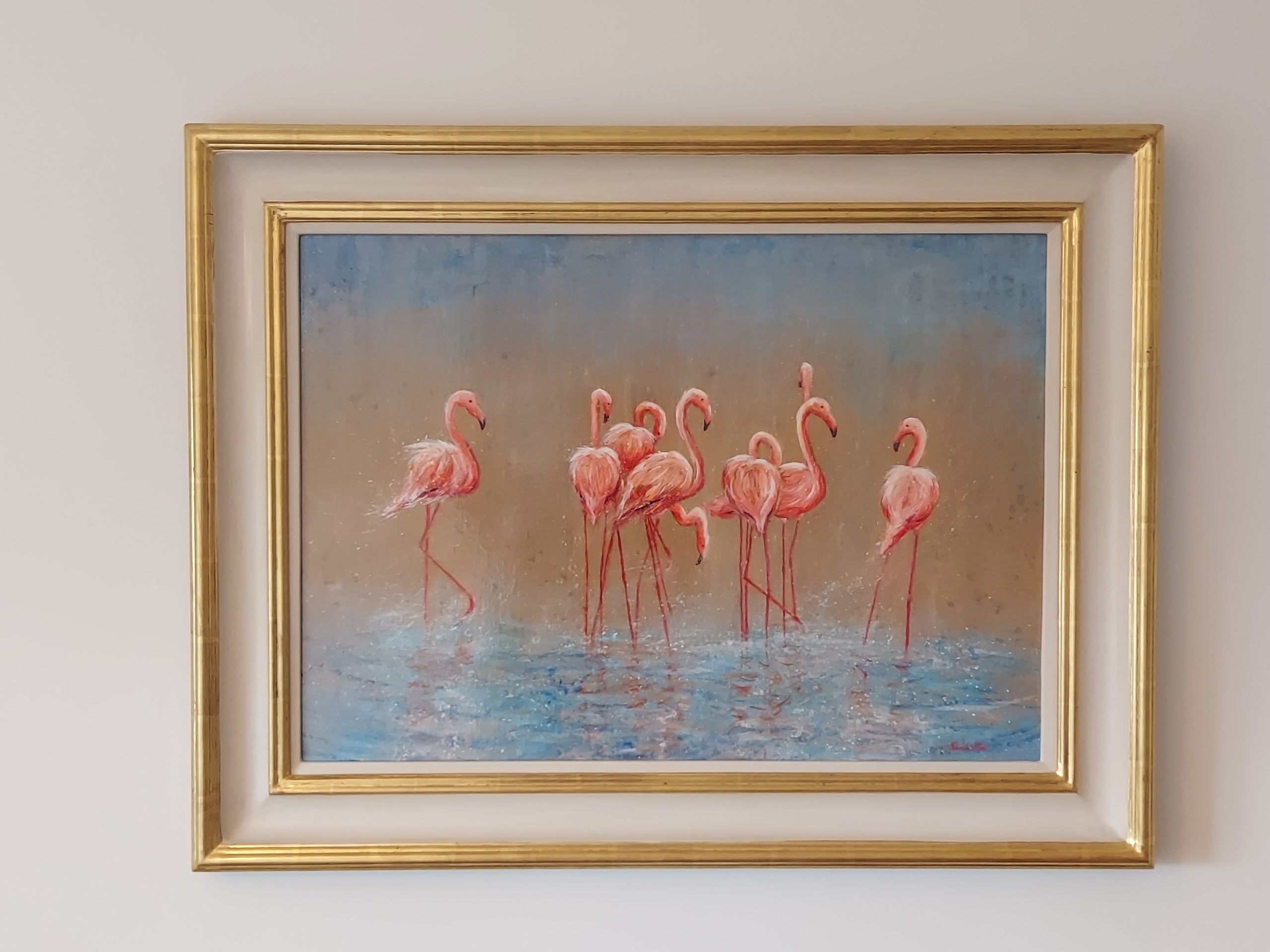 Framed Flamingoes, 27 x 35 inches Published 12.01.2025 at 2560 × 1920 in Wildlife and Sporting A Fantasy of Flamingoes, Oil on Canvas, SOLD, Gold Leaf and Painted Frame, 27×35″, £4,950