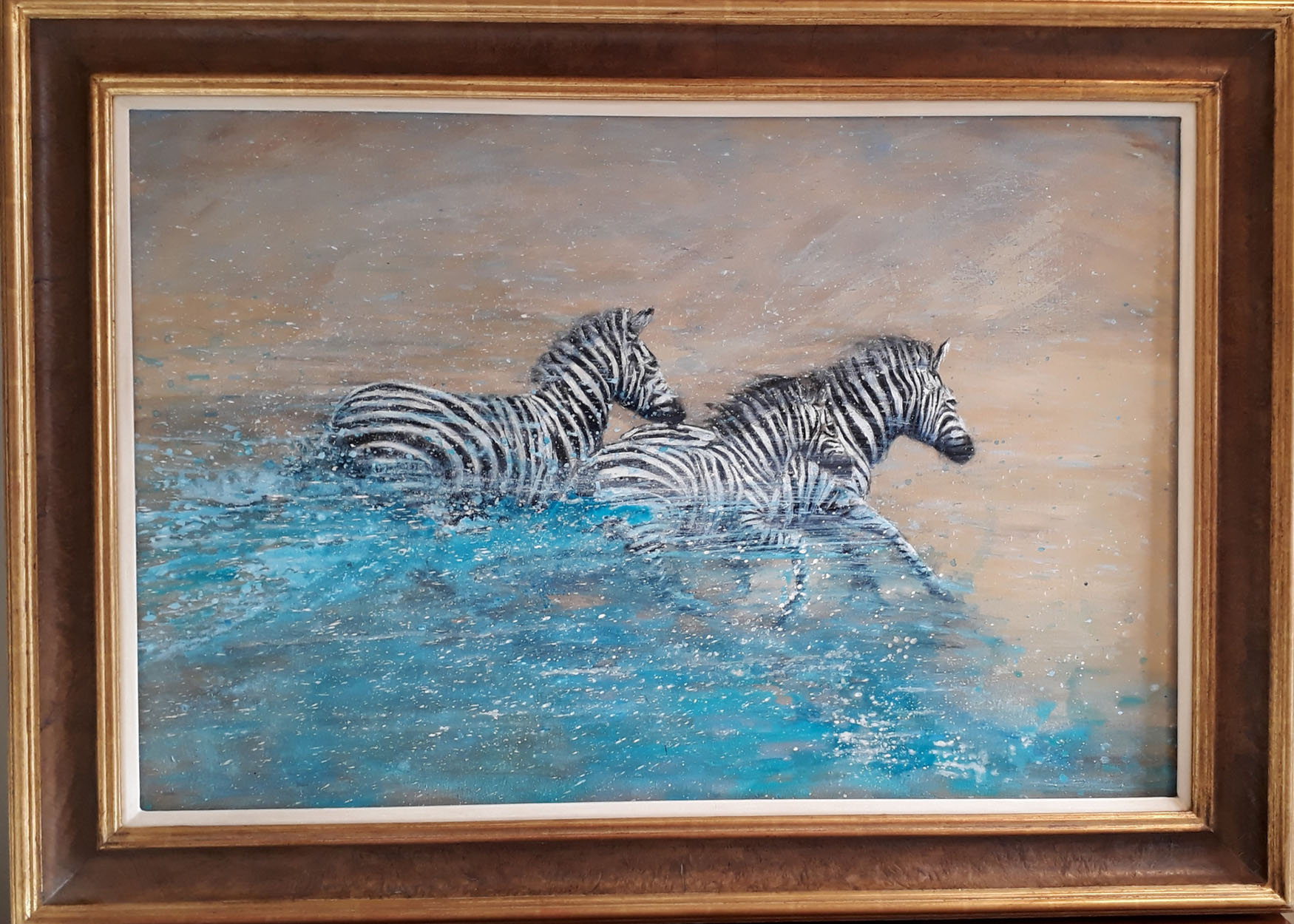 Reduced A Dazzle of Zebra Gold Leaf and Veneer Frame Published 07.12.2023 at 1750 × 1250 in Wildlife and Sporting A Dazzle of Zebra, Oil on Canvas, 24×36″, Gold Leaf and Veneer Frame, 32×44″, £4,500