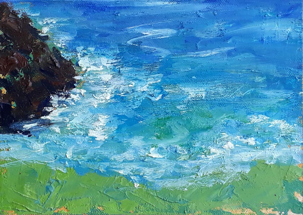 Web Cornish Waters Published 30.05.2023 at 1000 × 712 in Land’s End, Penberth and more Crystal Waters, Oil on Panel, 5×7″