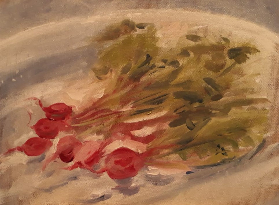 Homegrown-Radishes-1 Published 22.11.2021 at 965 × 709 in Homegrown-Radishes-1 Radishes, Oil on Panel, 7×9″, £395